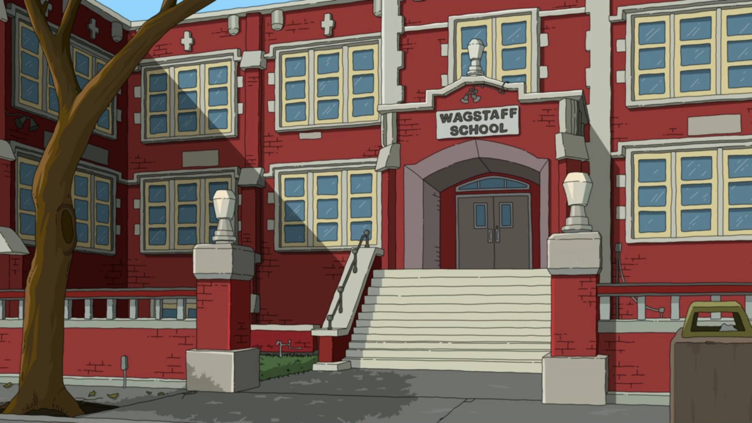 Wagstaff School (or Wagstaff for short) is where Louise, Gene, and Tina learn. The school is an old brick building, and it's at least 75 years old, having its 75th anniversary on "Crystal Mess." It first appears in the pilot episode, "Human Flesh," as a flashback. The school was the sole setting for "Work Hard or Die Trying, Girl." The school serves grades 3-8 at least.[Note 1]